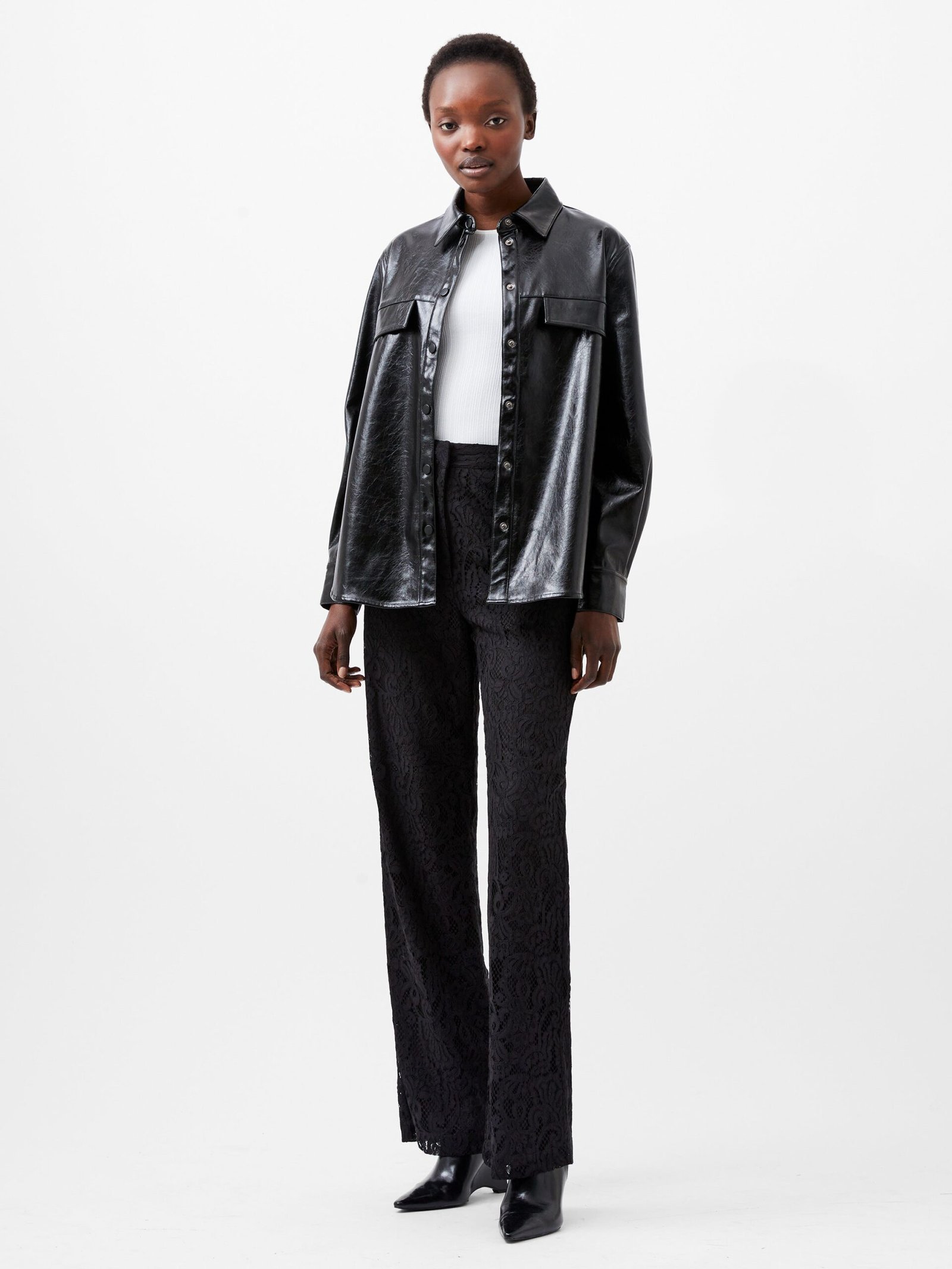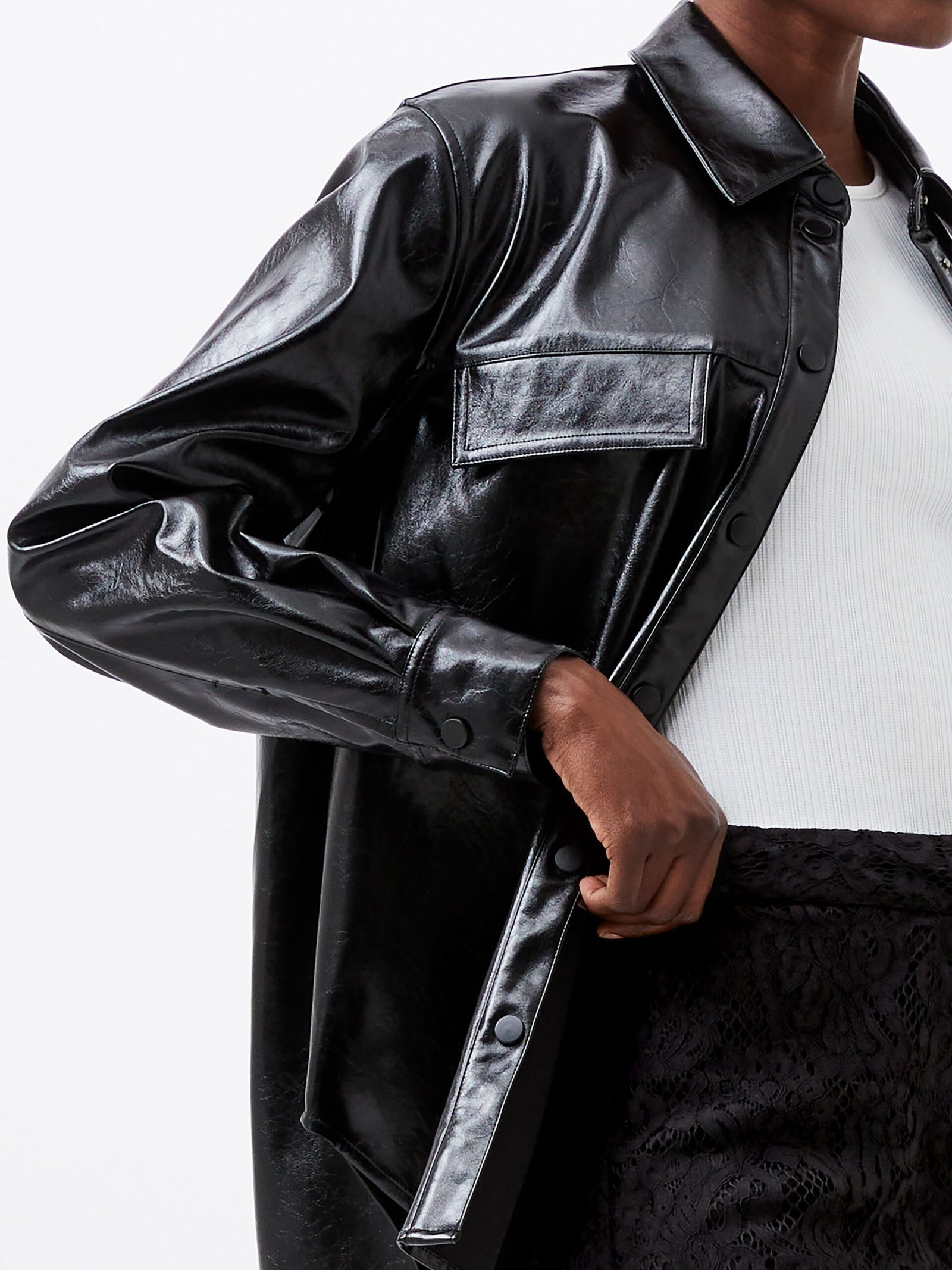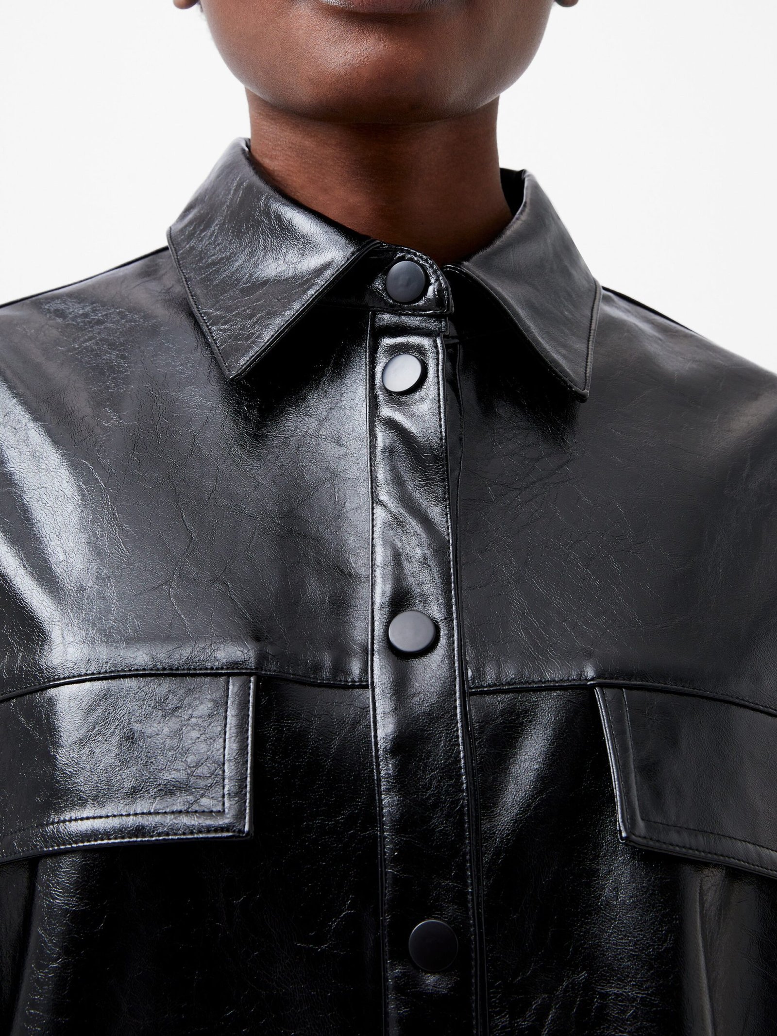 Layer up your looks with a slick leather. courtesy of our Emmett Vegan Leather Overshirt. This glossy overshirt is a modern must have with its sleek long sleeved silhouette paired with contemporary features. from popper fastenings to faux flap breast pockets. Style alongside our Emmett Vegan Leather Mini Skirt for modern matching ensembles.